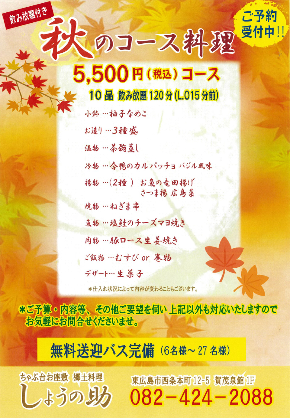 しょうの助、秋のコース料理登場!ご予約を承っております!